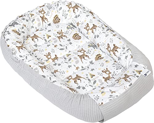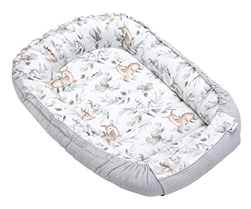 Medi Partners babybo bo bo för nyfödda – 100 x 60 x 15, babybo, dubbelsidigt, bo, säng, 100% bomull, våffel, gosigt bo bärbar (hjort och igelkott med ljusblå våffel)