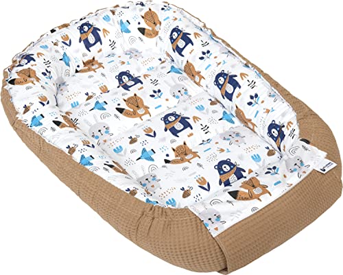 Medi Partners Babybo bo bo för nyfödda – 100 x 60 x 15, bebisbo, dubbelsidigt, bo, säng, 100% bomull, våffel, gosigt bo bärbart (Safari med beige våffel)