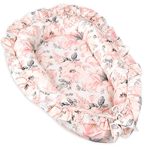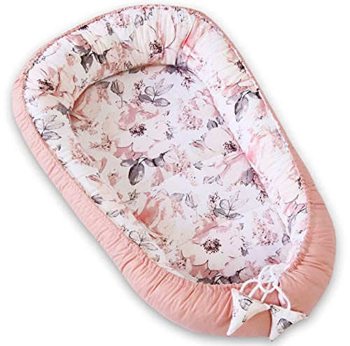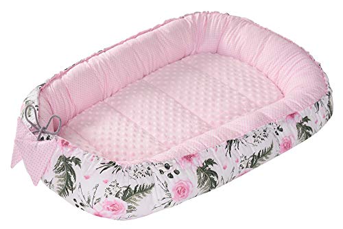 PIMKO Babybo, babybo för spädbarn, gosigt bo på 2-sidig babykokong för spädbarn och nyfödda, babybo, 100 % bomull, bo lämplig för hem, 55 x 90 cm, rosa/blommor