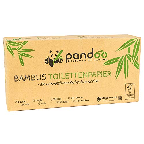 Pandoo 100 % bambu-toalettpapper | träfritt toalettpapper i plastfri förpackning, bambutoalettpapper | 3-lager och gosigt mjukt | 12 x 8 rullar á 200 ark (96 rullar)