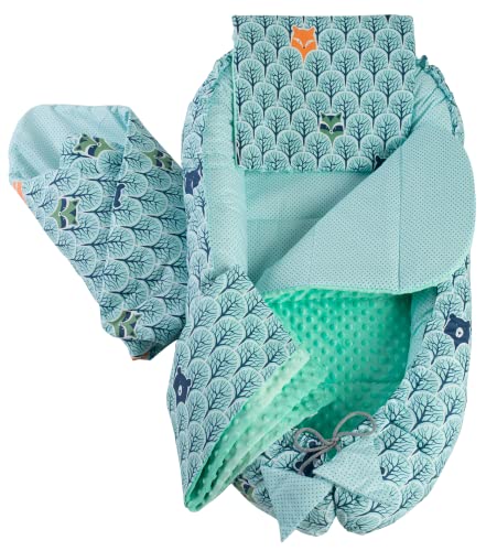 Medi Partners set med 5 delar, babybo, 100 x 60 x 15, avtagbar insats, säng, gosigt bo krypfilt för spädbarn, nyfödda, 100% bomull (skog med mynta minky)