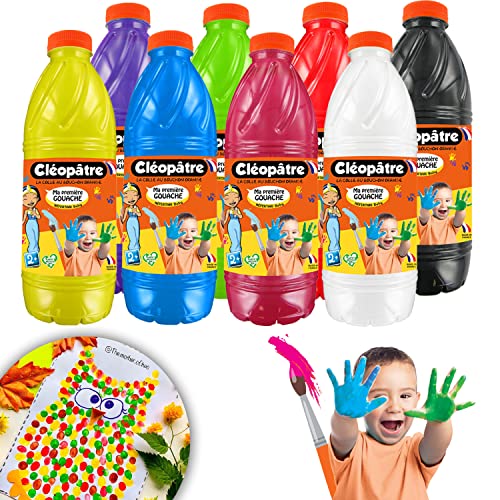 CLEOPATRE First Gouache Baby 2-EN-1-Paint 8 penselfärg 1 L tvättbar fingerfärg för barn från 2 år, blandade färger, 1 liter, set med 1 000 stycken