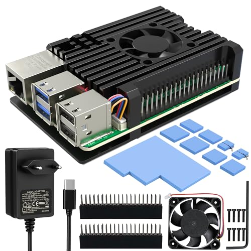Miuzei kylarhölje för Raspberry Pi 5 med 5A strömförsörjning:5,1 V 27 W GaN-adapter och PWM-fläkt GPIO huvud passiv aktiv kylare kylare aluminium fodral för Raspberry Pi 5 4gb och 8 gb box med