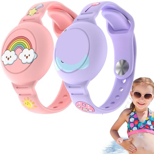 2 stycken barn vattentäta armband för AirTag silikon anti-förlust GPS-hållare fodral för småbarn helkroppsskydd dold AirTag armband skyddsfodral för barn (rosa + lila)