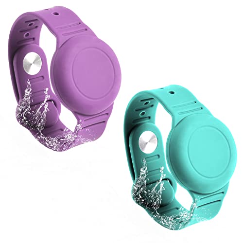 2st Barnarmband för AirTag, Vattentätt Silikon AirTag Armband för Barn Småbarn Fläder, Justerbart Klockband Anti Lost AirTag Fodral Hållare för att Dölja GPS-Spårare (Lila, Grön)