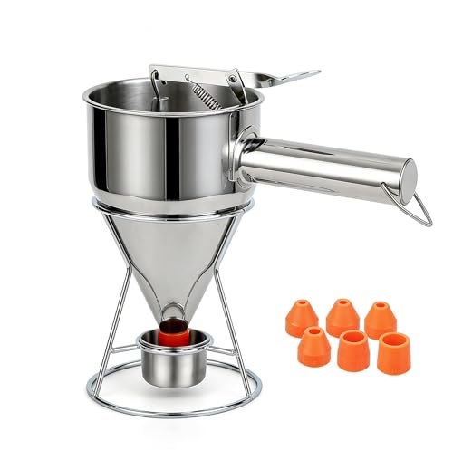 eGenuss 1 bakningstratt i rostfritt stål pannkaksdegsutdelare + 7 olika munstycken + fast stativ med deguppsamlare + påse | degportionering med graderat mått | 1200ml