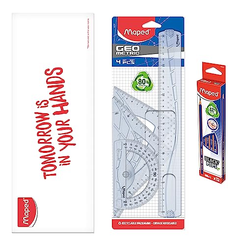 Maped - Komplett set med geometri och matematik - 2 kompass (ring och min), 15 cm linjal, 180° gradskiva, vinkel, suddgummi, pennvässare och penna - set med flera produkter