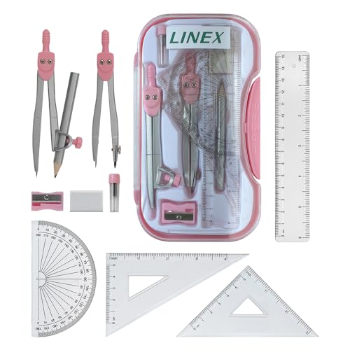 Linex matematik geometri set med transparent fodral – rosa 10-delars undersökningskit med kompass, gradskiva, linjal, set fyrkanter och suddgummi