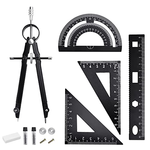 YAANBUNB 6 st geometri-set aluminiumlegering linjal set geometri kompass set matematiklinjal geometri verktygssats inklusive linjal, gradskiva, kompass och radergummi för skolelev lärare arkitekter