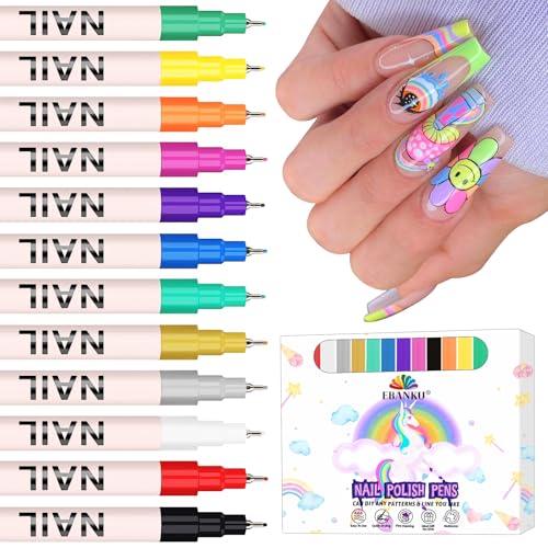 EBANKU Jul 12 färger nagelkonst pennor set, 3D 0,5 mm graffiti-akrylfärg nagelkonst märkpenna snabbtorkande nagelspets, graffiti-punktering liner pennset för hem och salongen nagel-gör-det-själv
