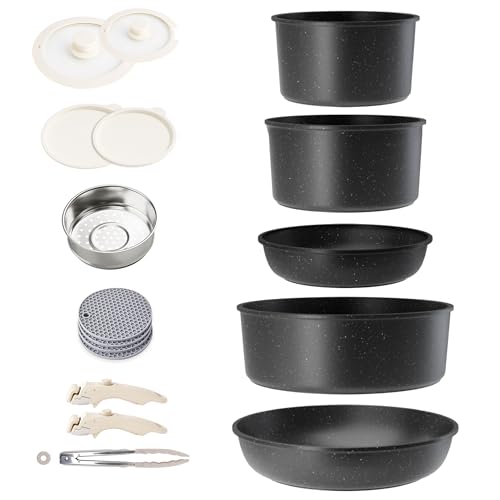 RIOVARM Induktion kastruller och stekpannor set med avtagbara handtag, non-stick granit, stapelbara köksredskap set med silikonlock, platsbesparande kastrull- och stekpannor utan PFOA, stekpanna,