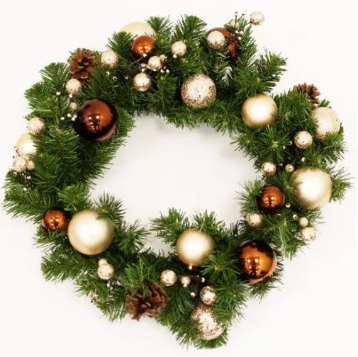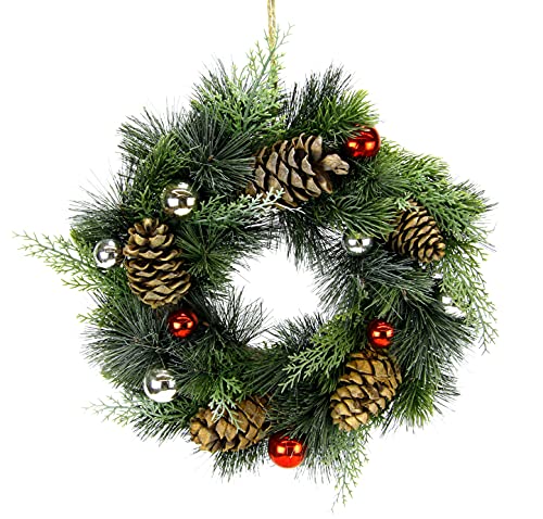 Dekorerad granmix-krans med kottar och kulor, julkrans, grangrenar, cypress, vintergrön, grankrans, julkrans, färdigdekorerad krans, dörrkrans, dekoration, juldekoration, julgranskulor