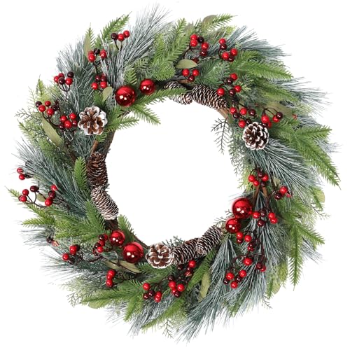 Weldomcor 60 cm julkrans, dörrkrans, stor julgirlang, grankrans med julgranskulor, tallkottar, bär för ytterdörr, öppen spis, väggdekoration