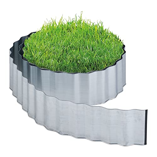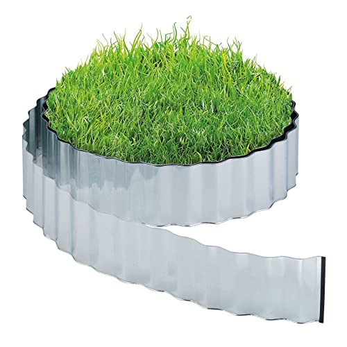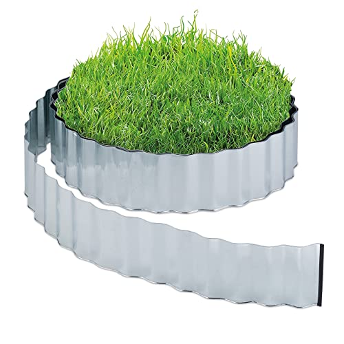 Relaxdays Gräskant, 6 m, rabattbegränsning av metall, förzinkad, flexibel, inramning för rabatter eller gräsmatta, 16 cm hög, silver