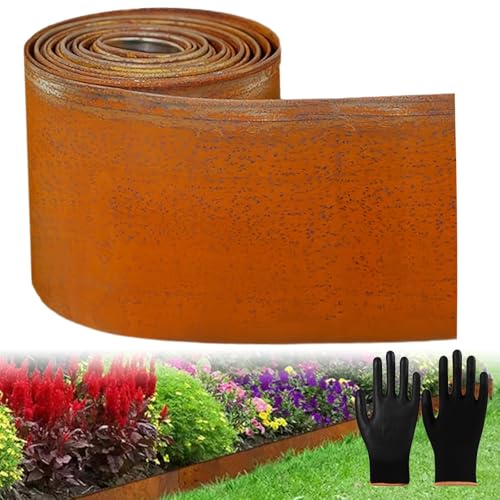 10 m x 15,5 cm Hög Rabattkant av Metall, Cortenstål Gräskant med Rostutseende för Gör-det-själv-Trädgård - Galvaniserad med 1 Par Handskar