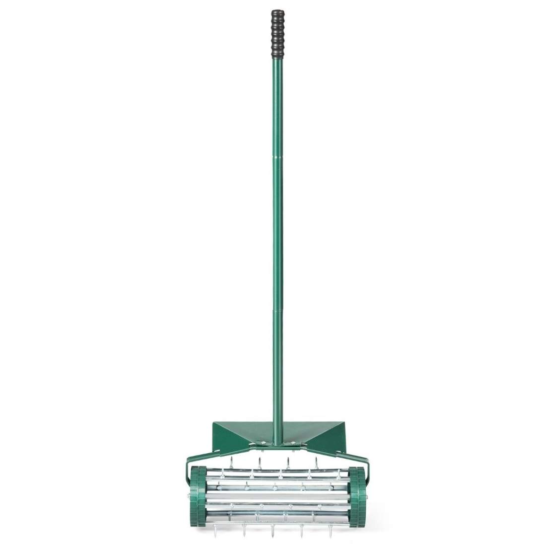 Gräsluftare rulle gräsmatta med handtag & 3 cm spik & stänkskydd 46 x 23 x 127 cm mörkgrön och silver