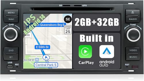 YUNTX Android 14 bilstereo kompatibel med Ford Transit/Focus/Fiesta/Fusion/Kuga – GPS 2 Din – gratis bakre kamera och MIC&Canbus – stöder DAB+/rattkontroll/4G/WiFi/Bluetooth/MirrorLink/Carplay