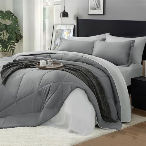 BEDELITE Queen täcke set 7 delar säng i en väska – mjukt mikrofiber, vändbart grått set med täcken, lakan, örngott och örngott, mysiga lyxiga sängkläder för alla årstider