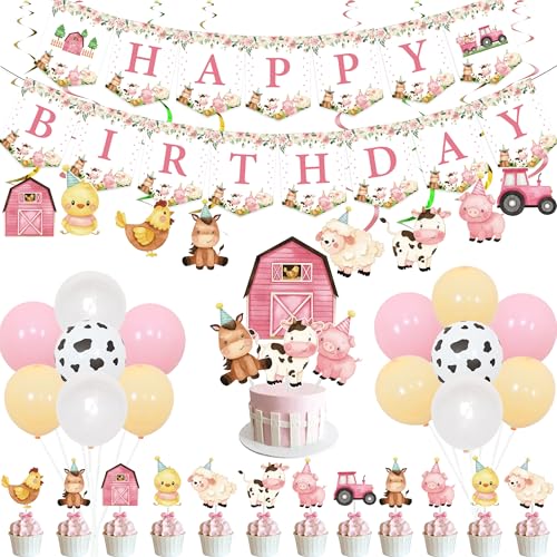 Rosa gårdsdjur Födelsedagsdekorationer för flickor gårdshus blommigt tema grattis födelsedagen banner ko gris åsna ballonger hängande virvlar kaka cupcakes toppers för barn barngårdstema barngårdstem