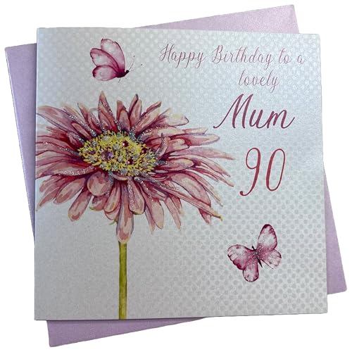 VIT BOMULL Grattis på 90-årsdagen till en härlig mamma handgjord kort rosa gerbera-blomma, DS25, 16 cm x 16 cm