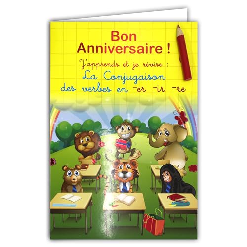 67-1103-B Grattis på födelsedagen pedagogiskt kort med slumpmässig färgpenna och gult kuvert jag lär mig och reviderar konjugationer av verb prata sluta förlora för barn CE1 CE2 6 7 8 år