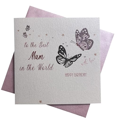 vita bomullskort 'Best Mum in The World' grattis på födelsedagen handgjort kort med vintage fjärilar, PDT1PWORLD