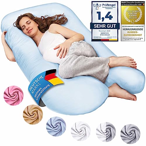 SMOOTHY Graviditetskudde, sidokudde, stödkudde, babykudde och amningskudde i U-form med avtagbart och tvättbart överdrag av 100% bomull (junior XL, 120 x 70 cm, ljusblå)