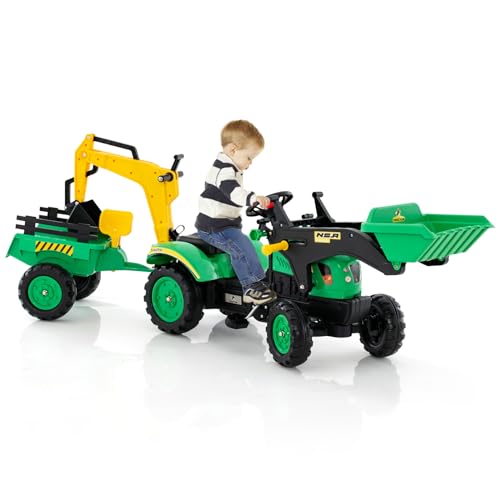 COSTWAY Trettraktor, barntraktor med avtagbar släpvagn och grävspade, grävmaskinslastare som kan belastas upp till 35 kg, grävmaskin för barn från 3–6 år (grön)