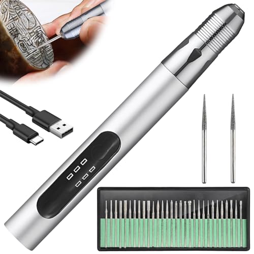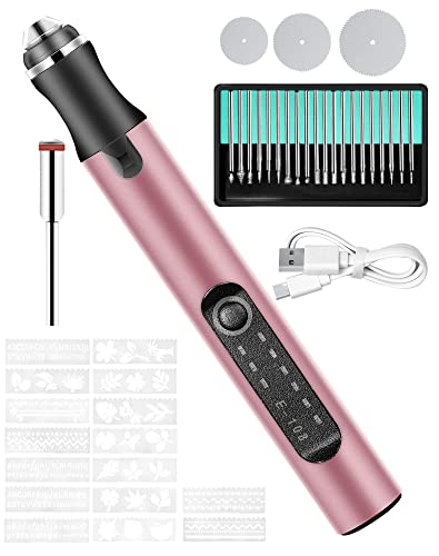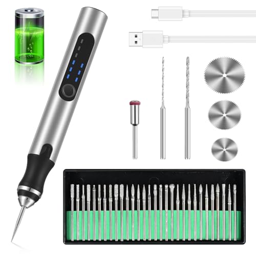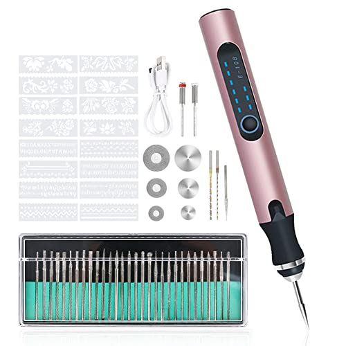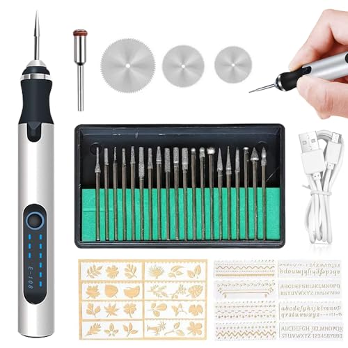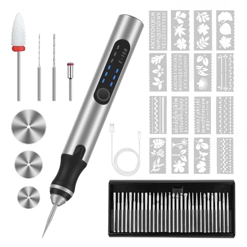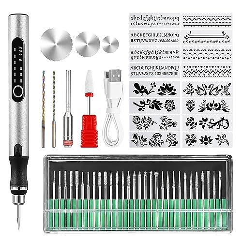 Weinsamkeit Elektrisk gravyrpenna, uppladdningsbar USB-gravyrverktygssats med 37 bitar och 5 schabloner trådlös miniborrmaskin bärbar gör-det-själv roterande gravyr för smycken glas plast trä