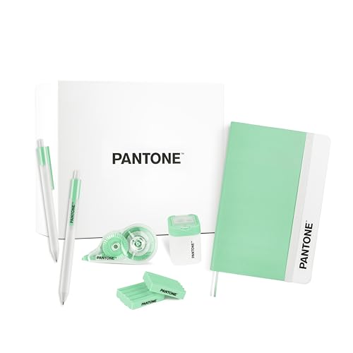 PANTONE™ Pastell presentbox - brevpapper och skolmaterial med vit concealer med 10 m band, svart gelkulspetspenna, 0,7 mm 4 st, pennstorlek med behållare, anteckningsbok och 2 suddgummin