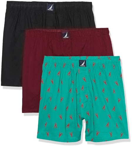 Nautica Men's Cotton Woven 3 Pack Boxer, Black/Tawny Port/Lobsters-Pepper Green
