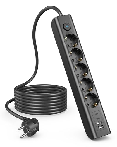 LENCENT 5-vägs Europeiska Grenuttag med Strömbrytare, 8 i 1 Uttag Strömlista med 2 USB-A & 1 Typ C, Europa Power Strip 3 Meter Flätad Kabel för Vägguttag Multipeluttag, Type C/E/F