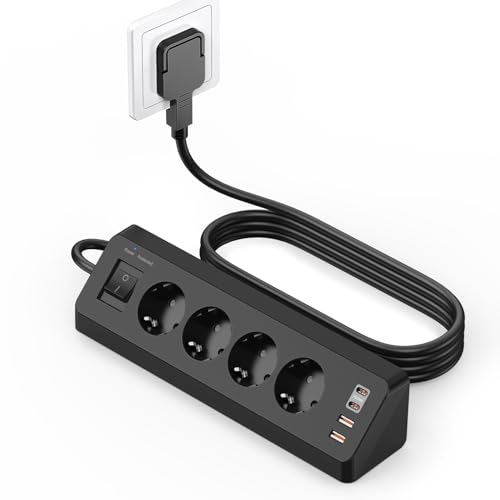 JSVER 8-vägs Grenuttag med 4 USB-portar, USB-Smartladdning med Switch, Väggmonterat överspänningsskydd 5M för Smartphones, Surfplattor-Svart