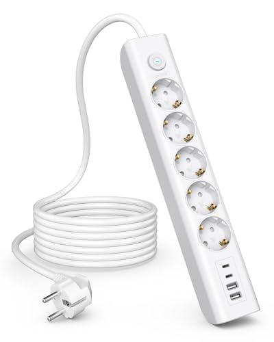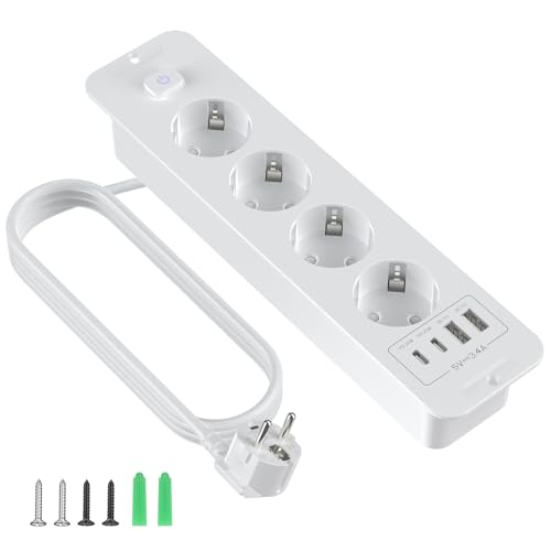 5-vägs grenuttag, 9 i 1 flera uttag med USB, 3 680 W grenuttag med strömbrytare, 16 A flera kontakter med USB C, väggmonterad fördelningsuttag för kök kontor, 1,8 m kabel, vit