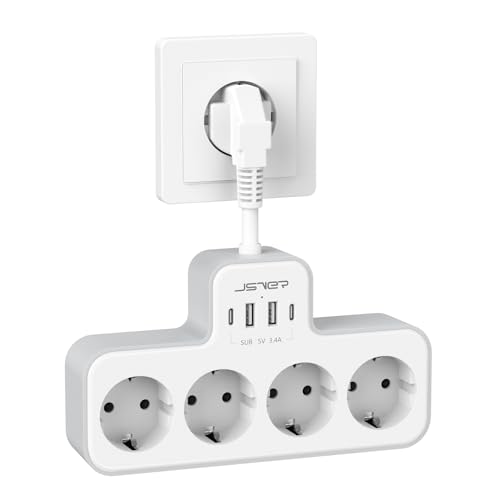 JSVER 8 i 1 Grenuttag med Individuell Strömbrytare, 4-vägs överspänningsskydd med 4 USB(2 A & 2 C, 17w), Multipeluttag med 2M för Hem, Kontor, Resor eller Kök-Vitt