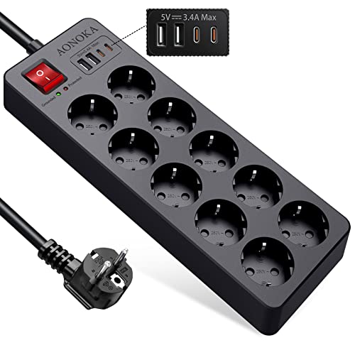 Grenuttag överspänningsskydd Upp Till 1700 Joule, Flera Uttag Strömlist med USB C 10-vägs,10 Euro Uttag och 4 USB Laddningsstation Uttagslist Väggmontering med Strömbrytare Förlängningskabel 1,5M