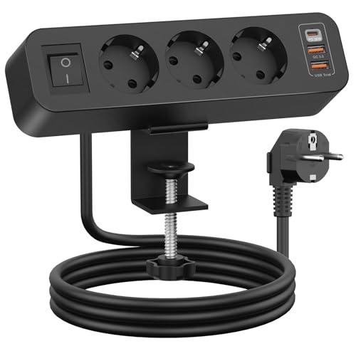 NTONPOWER grenuttag skrivbord med strömbrytare, 3-vägs bordsuttag med USB-C, 2 meter kabel, 2 500 watt flera uttag bord för kontor kontor, svart