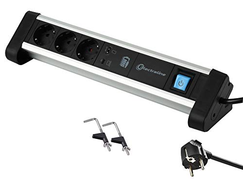 Electraline 62556 grenuttag 3-vägs aluminium för skrivbord med 2 USB 60 W (1 typ C PD för laddning av datorer + 1 USB 3 A) kabel 2 m/bordsuttag gren/mångsidigt skrivbord