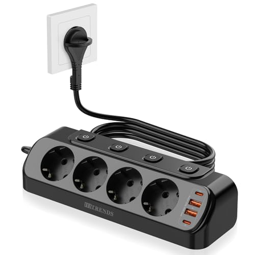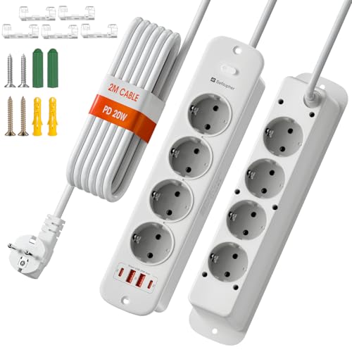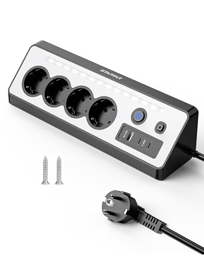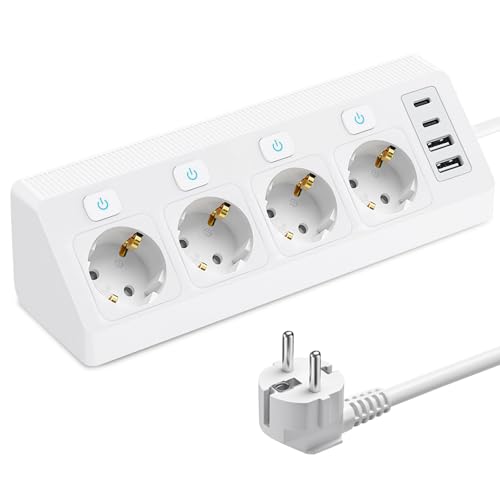 TESSAN 4 grenuttag med USB C, 10 m förlängningsslack, 7 i 1 grenuttag med strömbrytare, 2500W väggdistributionsuttag, vitt skrivbord, multikontakt med USB