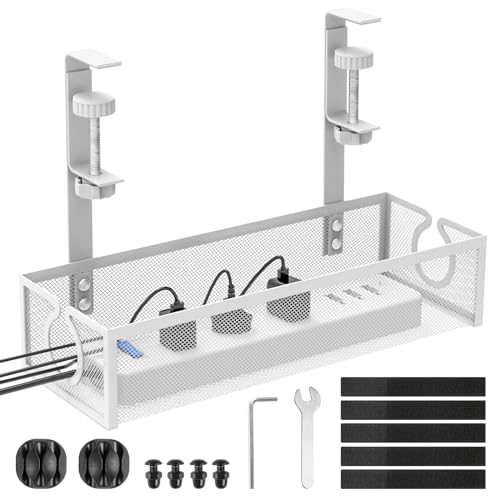 REFLYING Ingen borrning under skrivbord kabelhanteringsbricka, uppgraderad kabelbricka med klämma för skrivbord, robust metallkabelhantering racerbana för grenuttag, vit, 1-pack
