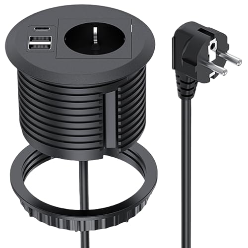 Inbyggt skrivbord uttag, inbyggt uttag med USB med 1 Schuko, 2 USB-port, 1 Type-C-kontakt, 1,7 m kabel grenuttag med USB för 80 mm bordshål bänkskiva kök, svart