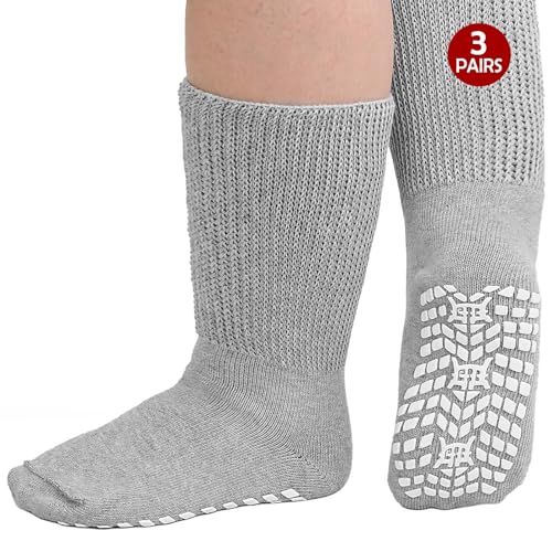 ZFSOCK Diabetiska strumpor för män och kvinnor: ABS stoppa strumpor med grepp, utan elastisk linning. Halkfria, extra breda strumpor i bomull för ökad komfort. Levereras i 3 par 47-50 Grå