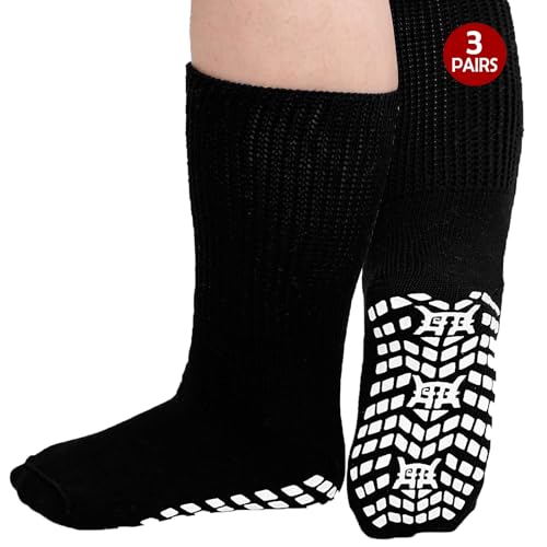 Dr.Socks 4-pack bambu diabetiker knähöga strumpor med grepp | Herr & damer | Extra breda långa toffelstrumpor för svullna fötter och ben, Svart, 46-48 EU