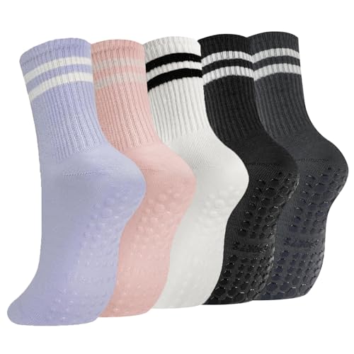 flintronic Halkfria yogabyxor, pilatesstrumpor med grepp för kvinnor och män, långa strumpor med dubbla ränder, svettabsorberande bomull full tå strumpor för dans, barre balett, fitness, hem, 5 par