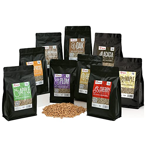 BBQ-Toro Pellets set av 100 % trä | urval från 9 sorter om 1 kg | rökpellets för grill, röker, pelletspizzaugn och värmesystem | grillpellets