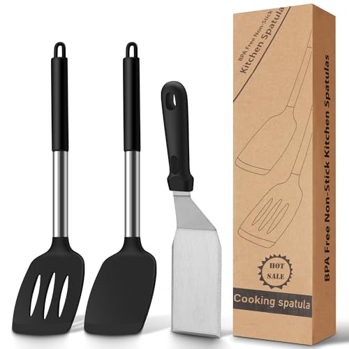 Stekspade set 3 delar, silikonspatel med handtag i rostfritt stål, värmebeständig spatel och grillspatel, non-stick, kökshjälp för stekpanna, grill, kastruller, svart
