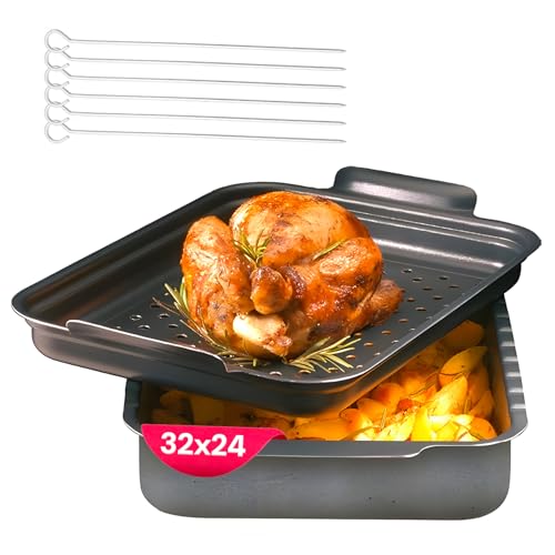 Non-stick-stekpanna med spett, 32 x 24 cm – förstärkt stenform för pizza, lasagne, rulle och grill – multifunktionell bakplåt i aluminium