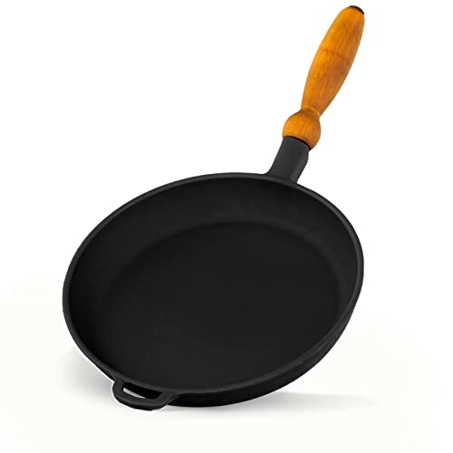 4BIG.fun 26 cm universell stekpanna av gjutjärn med trähandtag, låg, för bräsering och stekning, gjutjärnspanna för alla typer av spisar, grill och eld, med handtag, induktion, svart, obelagd