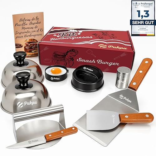 Professionell Smash Burger-sats – Hamburgerpress, spatel, köksfläkt, grillset, kökstillbehör för män – rostfritt stål, perfekt för grill eller stekpanna (Marron)