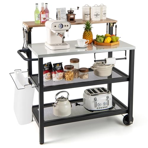 GOPLUS Grillvagn utomhus, BBQ grillbord 3 våningar med 4 hjul och 3 krokar, serveringsvagn rostfritt stål med stor arbetsyta, grillbord för bakgård, terrass och trädgård, 72,5 x 41 x 80 cm